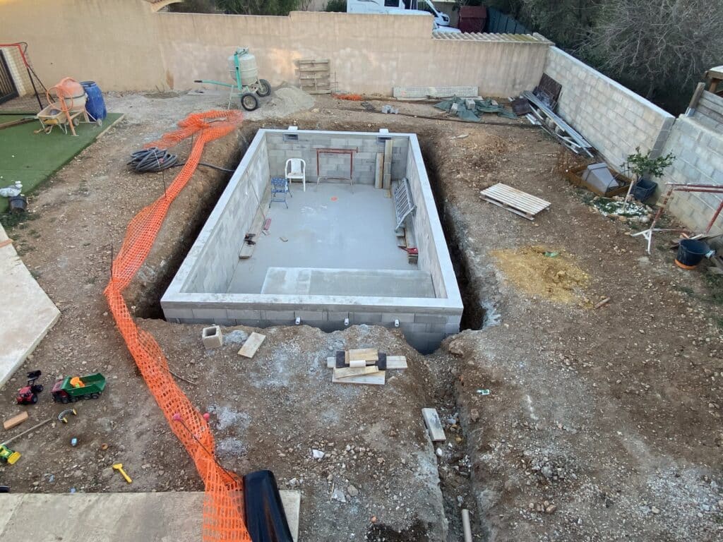 Les murs du bassin et les murs de soutènement ont été montés en parpaings et béton. Avec un ferraillage et des reprises adaptés, conformément aux règles de l’art.